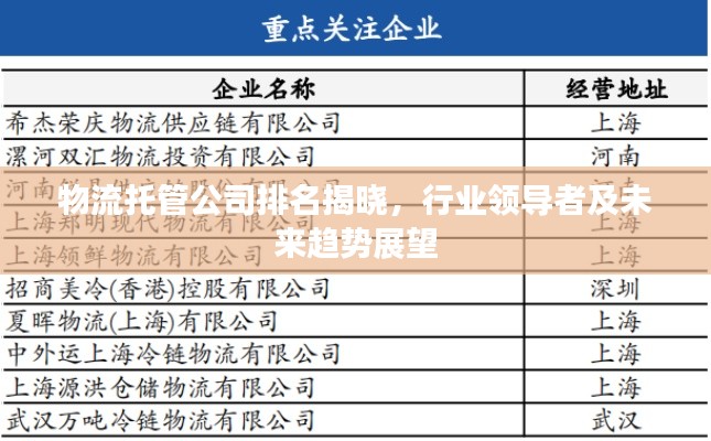 随着全球化和电子商务的飞速发展,物流托管行业在全球范围内呈现出蓬勃生机,本文将围绕“物流托管公司排名”这一主题,探讨物流托管行业的领导者以及未来发展趋势。