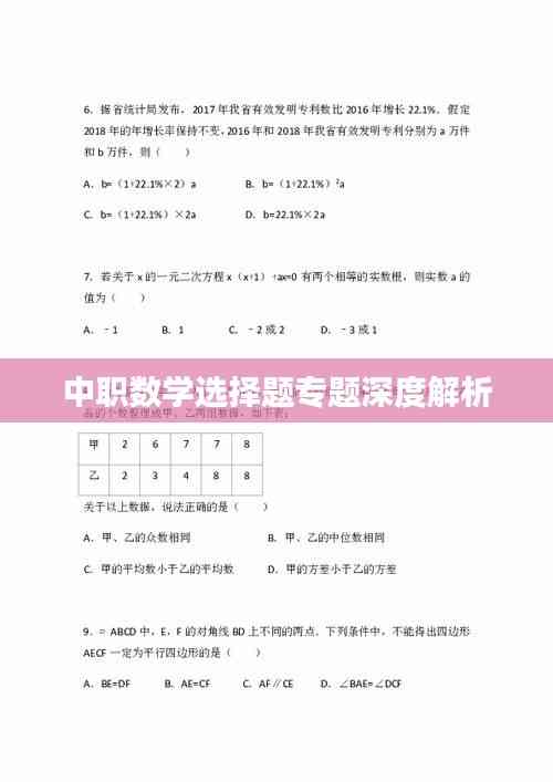 数学作为中职教育的重要科目,对学生未来的职业发展具有深远影响,选择题作为数学考试的主要题型之一,其考察内容涵盖了数学基础知识和实际应用能力,本文将围绕“数学中职选择题专题”进行深入探讨,帮助中职学生更好地理解和掌握数学知识,提高选择题答题技巧。
