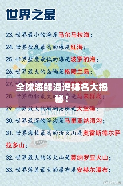 海洋的广阔与深邃孕育了无数美味的海鲜,世界各地有许多海湾因其丰富的海鲜资源而闻名于世,本文将为您揭示世界盛产海鲜的海湾排名,带您领略这些大自然的馈赠之地。